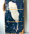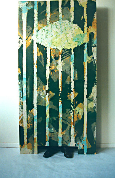 Tableau-sculpture à poser au sol contre un mur, contreplaqué, tissu, pastel, acrylique, objets, pâte à bois, 200 x 80 cm environ