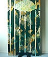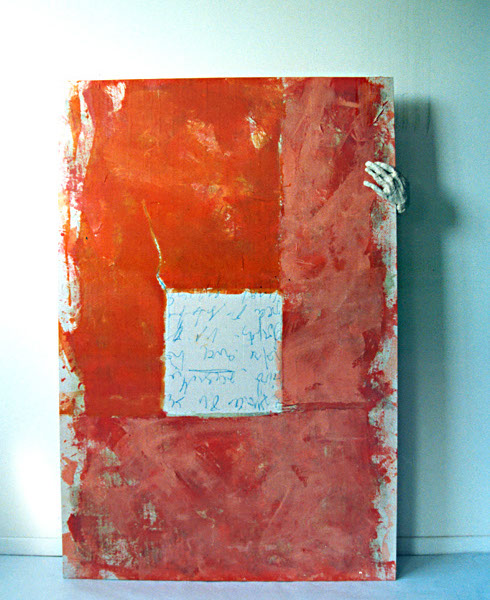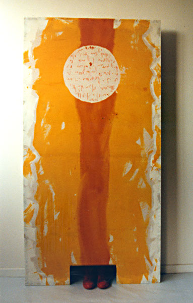 Tableau-sculpture à poser au sol contre un mur, contreplaqué, tissu, pastel, acrylique, objets, pâte à bois, 180 x 90 cm environ