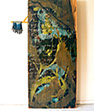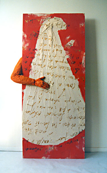 Tableau-sculpture à poser au sol contre un mur, contreplaqué, tissu, pastel, acrylique, objets, pâte à bois, 190 x 75 cm environ