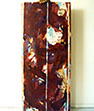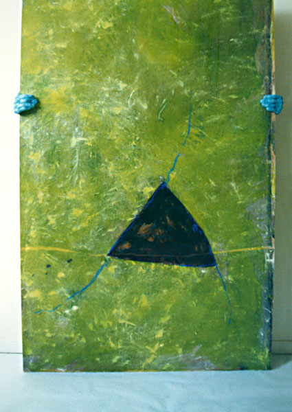 Tableau-sculpture à poser au sol contre un mur, contreplaqué, tissu, pastel, acrylique, objets, pâte à bois, 180 x 90 cm environ