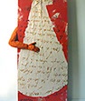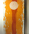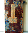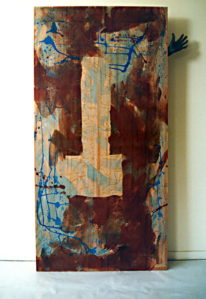 Tableau-sculpture à poser au sol contre un mur, contreplaqué, tissu, pastel, acrylique, objets, pâte à bois, 190 x 75 cm environ