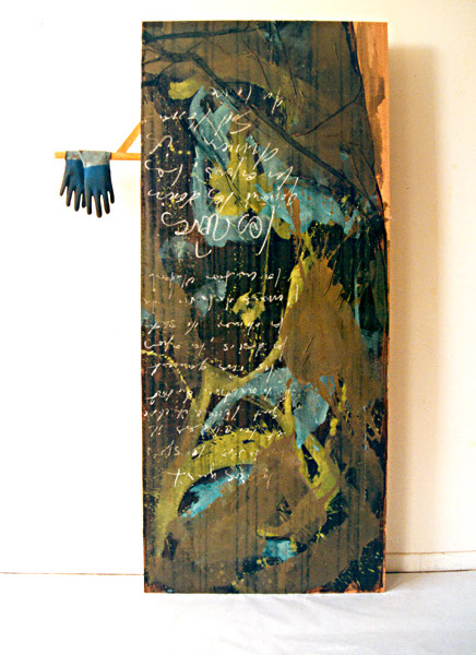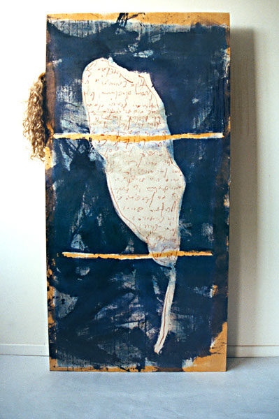 Tableau-sculpture à poser au sol contre un mur, contreplaqué, tissu, pastel, acrylique, objets, pâte à bois, 200 x 80 cm environ